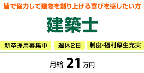 | 資格 | 要普通自動車運転免許(AT限定不可) 下記資格取得者歓迎 1級建築士、1級建築施工管理技士 2級建築士、2級建築施工管理技士 |